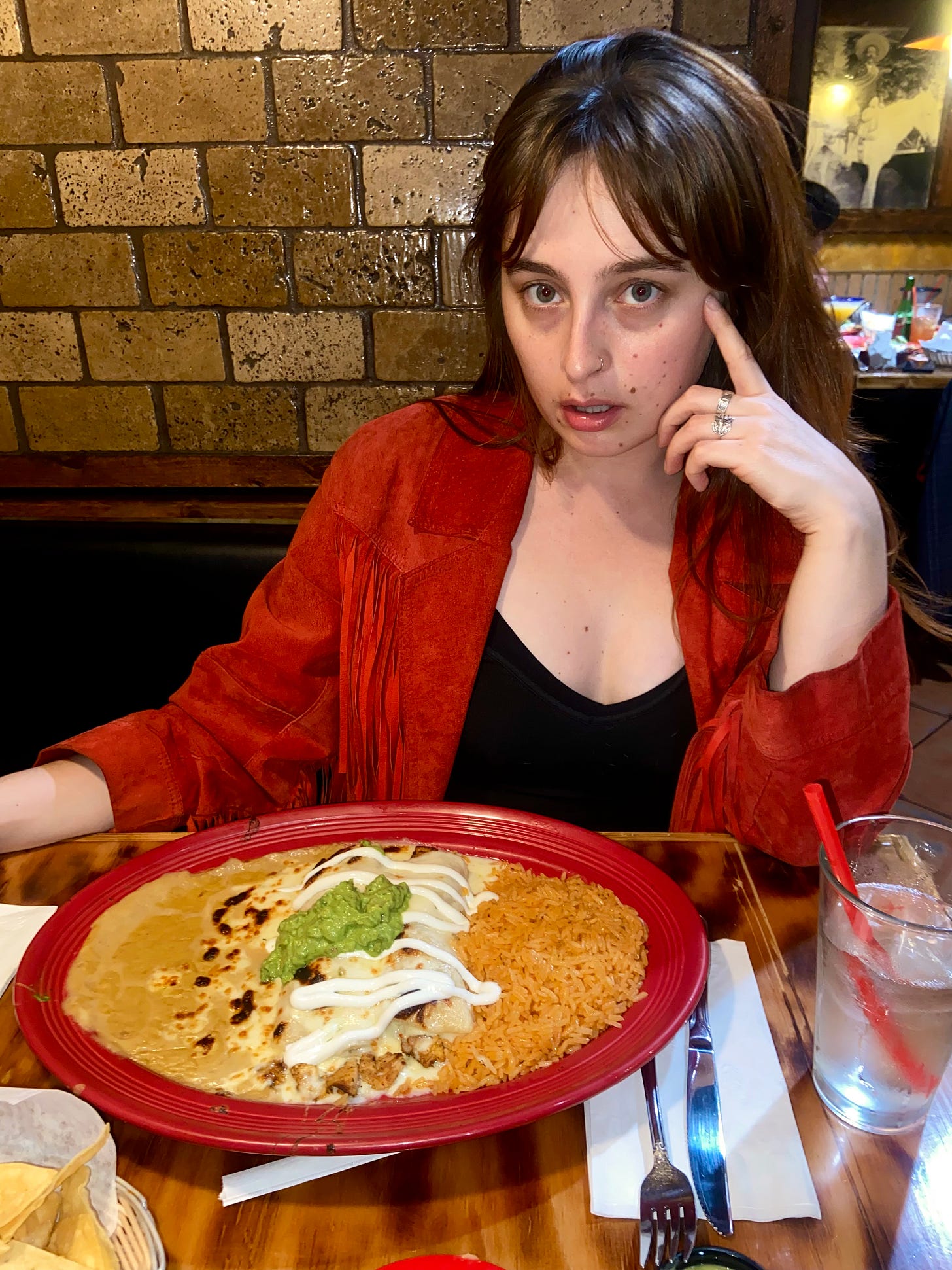 If I had to tik tokify this profile picture’s vibe I would call it Tex Mex Gothic. I’ve got on a fringe red suede jacket thrown over a scant black matching set. The glossy brick interiors of Salsa & Beer in the valley holding my pale, glowing form in its dark, protective shroud. The enchiladas wait patiently to be devoured. Obviously, my breasts are a little out. It’s a little fun, a little who cares, a little oopsie daisies.